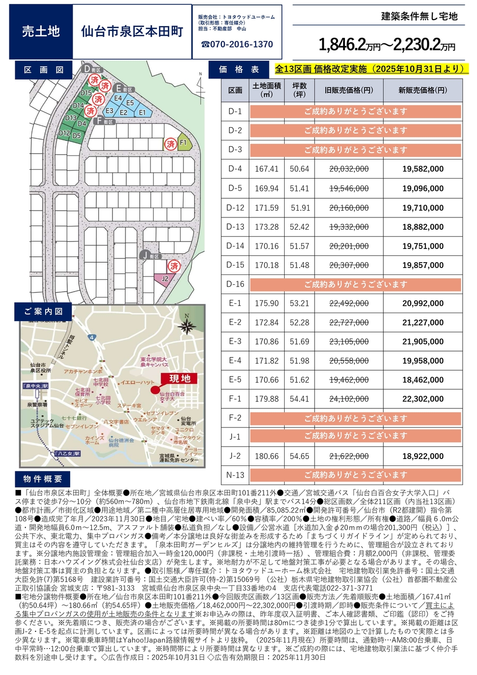 「泉本田町ガーデンヒルズ」建築条件無し宅地13区画の価格改定を実施しました。 ※上記のチラシをクリックすると、「E-5街区」のページに移動します。 仙台中心部へのアクセスが良好ながら、落ち着いた住環境が魅力の分譲地です。 通勤・通学・買い物にも便利で、日々の暮らしやすさを実感できる立地です。 便利さと静けさ、どちらも手に入れたい方にお勧めです。 資料請求につきましては、お気軽にご連絡下さい。