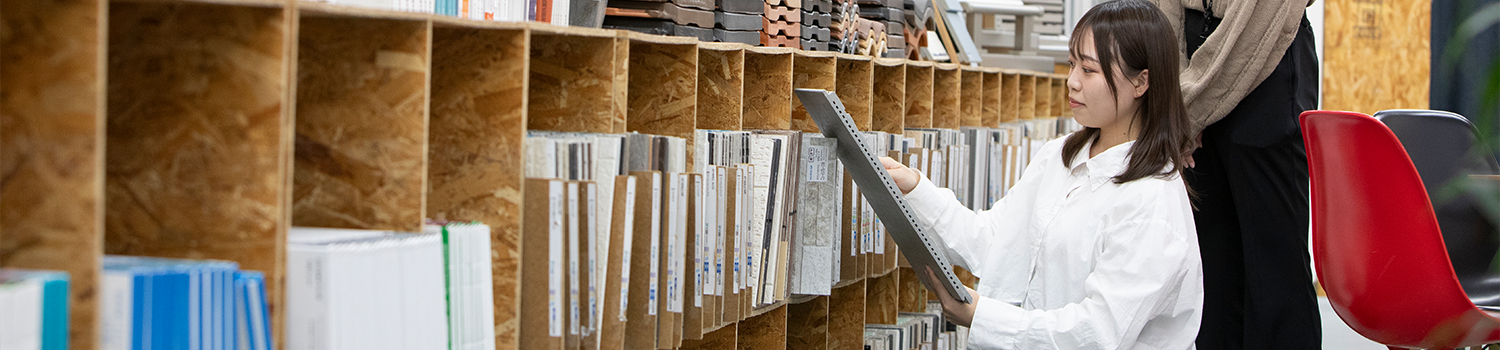 私は、設計部所属で意匠設計を担当し、建設予定地の敷地調査や役所調査をはじめ、お客様との打合せ、プランニングから図面作成、外壁や床材の選定、照明や壁紙、カーテン等の一連のご提案を行っています。
