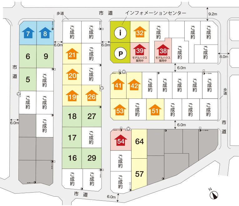 道路 | 既存道路:東 8.0m、西 6.0m、南 6.0m、北 9.0m・分譲地内:6.0mアスファルト舗装 |