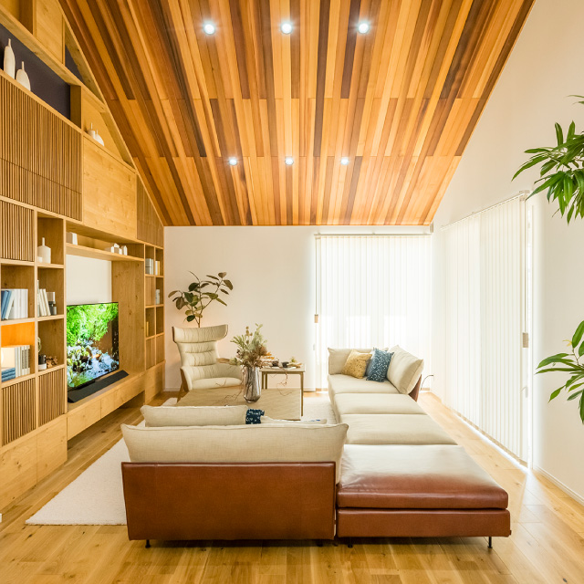 各部屋が廊下を介さず直接つながるから、空間にゆとりのあるプランニングが可能。また、2Fフロアがないため高い吹き抜けなど、天井の高さも思いのままに。平屋ならではの余裕のある空間は、快適な時間の流れを演出します。