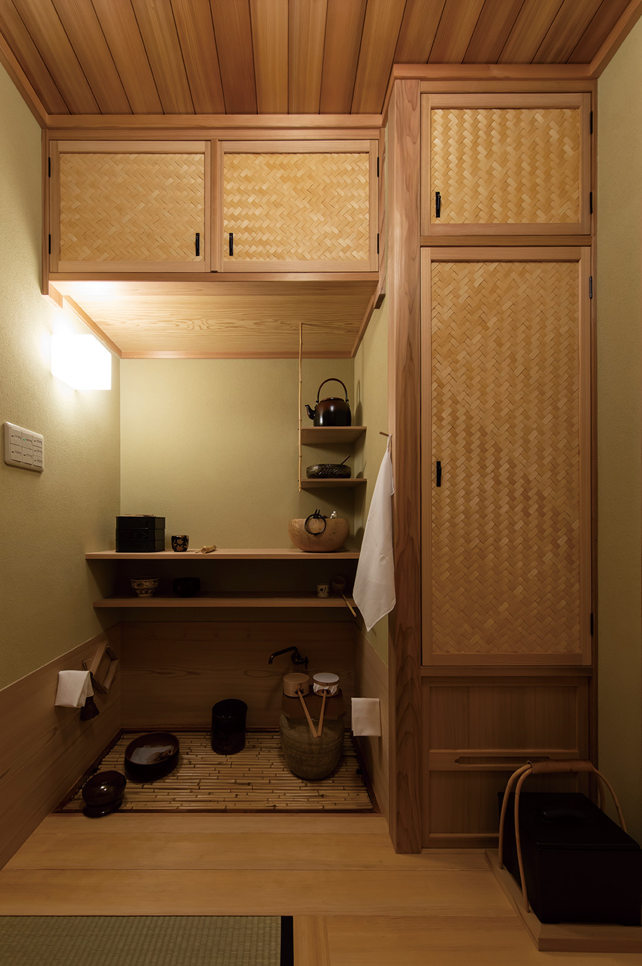 電気のスイッチは水屋にまとめ、コンセントは襖の敷居に埋め込み、吸気口は正面からは見えないよう琵琶棚の天井部分に隠す。