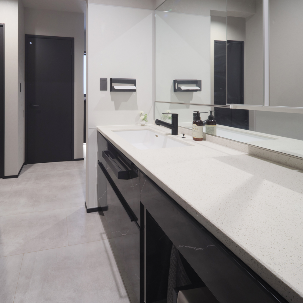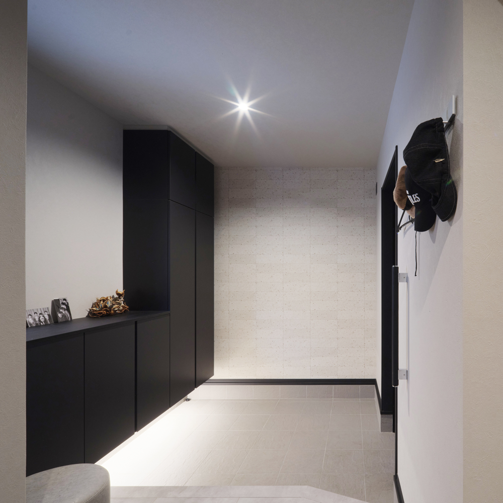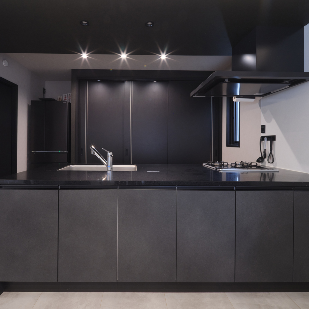 屋根は0.5寸の緩やかな勾配で設計し、三方を壁で囲むことで外観からは屋根が見えない構造に。屋根材にはシルバー色を採用し太陽光を反射させることで熱がこもりにくくなっており、外観の美しさを損なわずに快適な住環境を実現します。