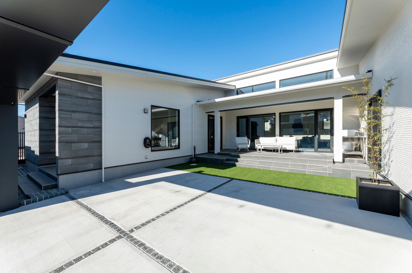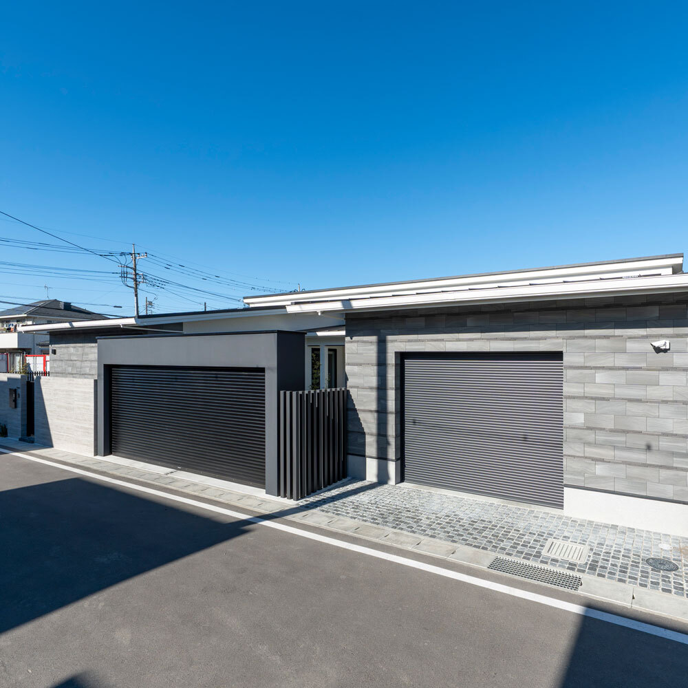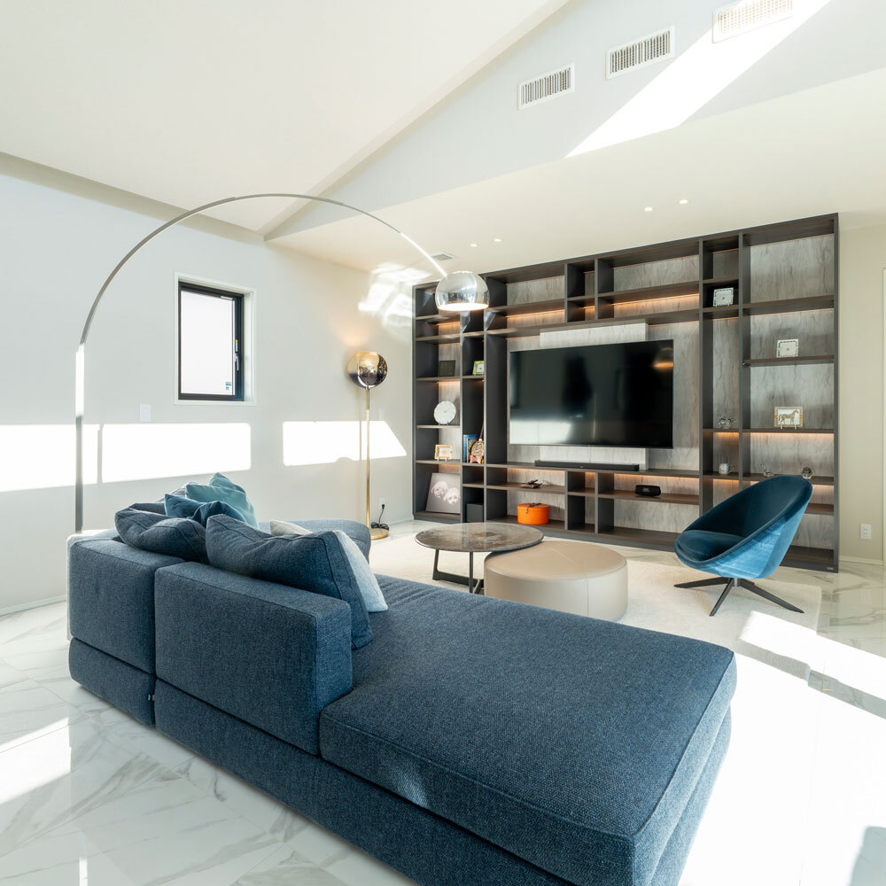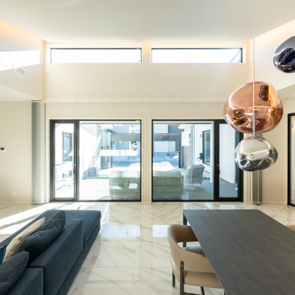 平屋だからこそ実現できる大スパンと勾配天井、大開口のサッシにより、圧倒的な開放感を感じられるリビング。高窓を設け、日中の安定した採光を確保しています。