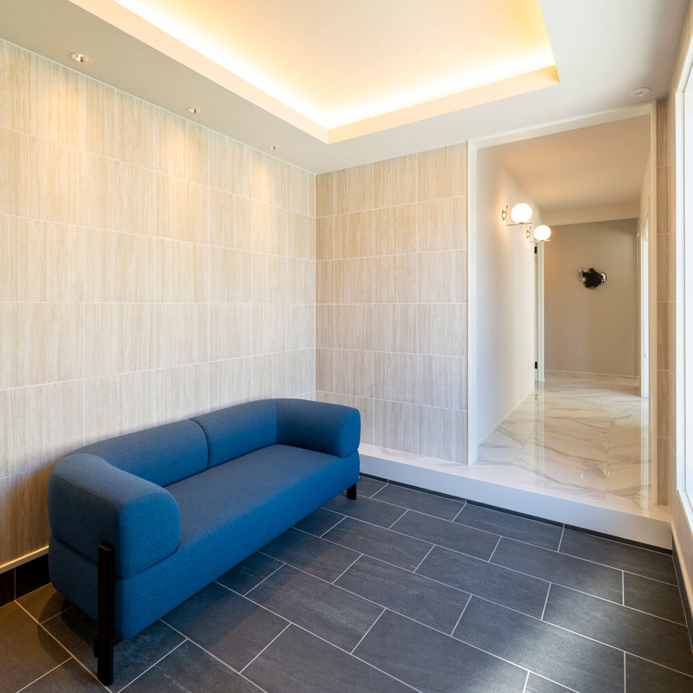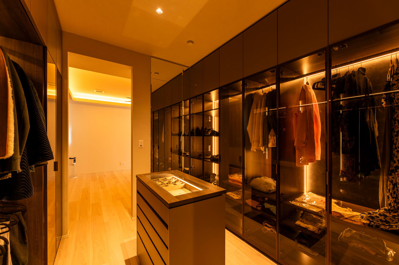 夜はやわらかな間接照明の光のなか、ホテルやギャラリーのような洗練された空間に。