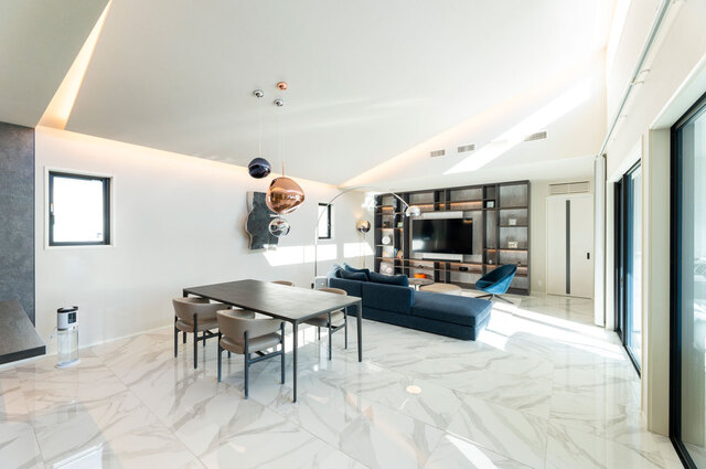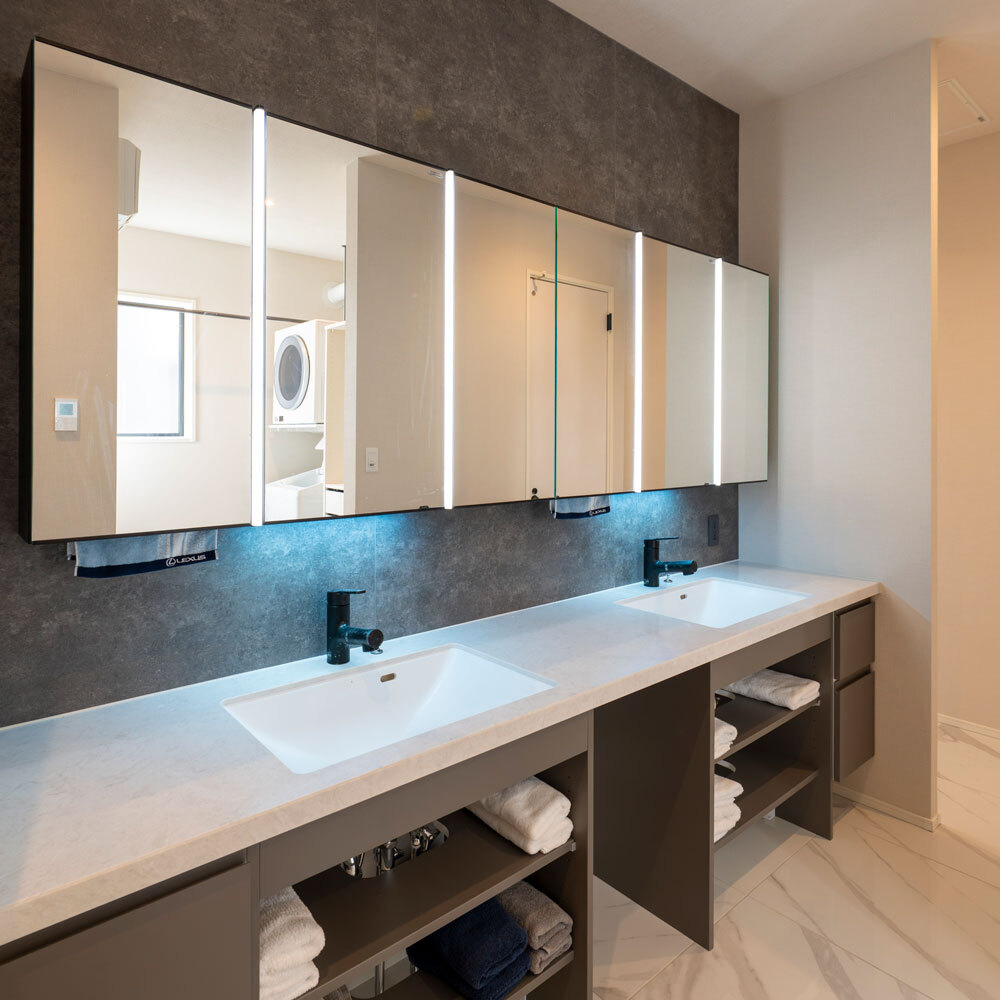 また、全館空調を採用しているため、室内は一年を通して快適な温度をキープ。空気の流れを整えるシーリングファンも不要で、天井まわりはすっきりとした美しいデザインを保っています。