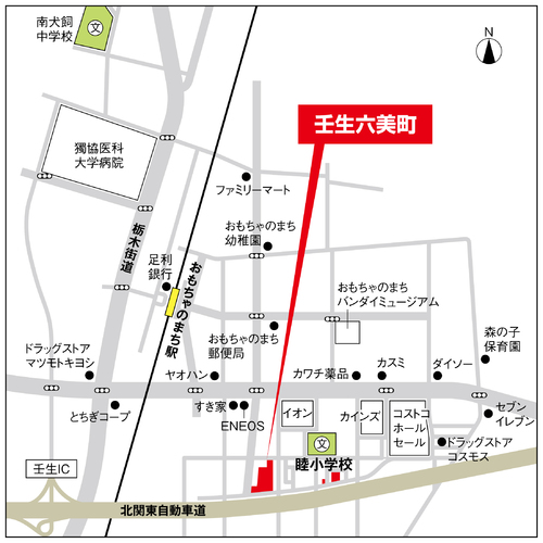 | 交通 | 東武宇都宮線「おもちゃのまち駅」 約1,090~1,500m 壬生IC 約1,560~1,980m |