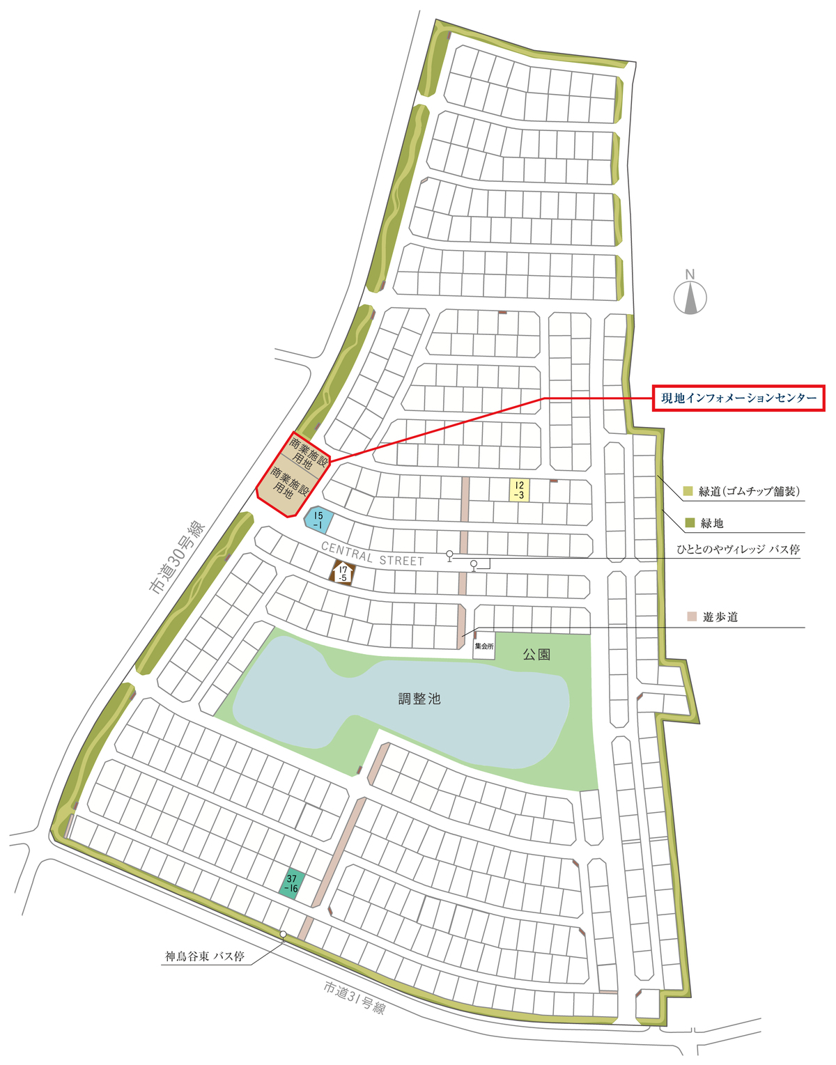 道路 主幹線道路=幅員12m・アスファルト舗装(内 歩道=幅員2.5m、両側、インターロッキング舗装)副幹線道路=幅員9m・アスファルト舗装(内 歩道=幅員2m、片側、インターロッキング舗装)