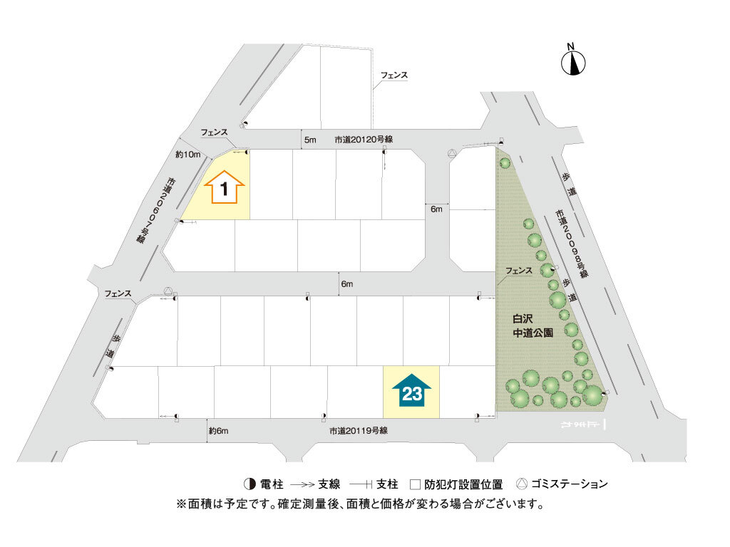 | 道路 | 開発道路 6.0m、既存市道 北側約5.0m、南側約6.0m、西側約10.0m |