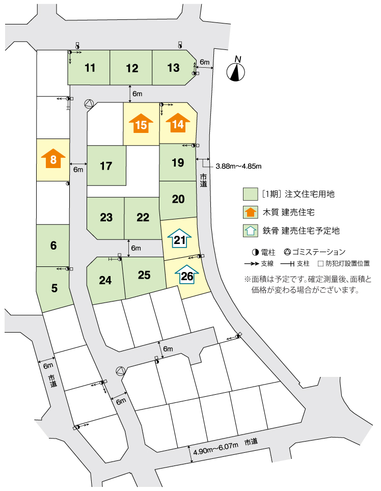 | 道路 | 新設(開発):6.0mアスファルト舗装 既存道路:東側3.88~4.85m 南側4.9~6.07m |