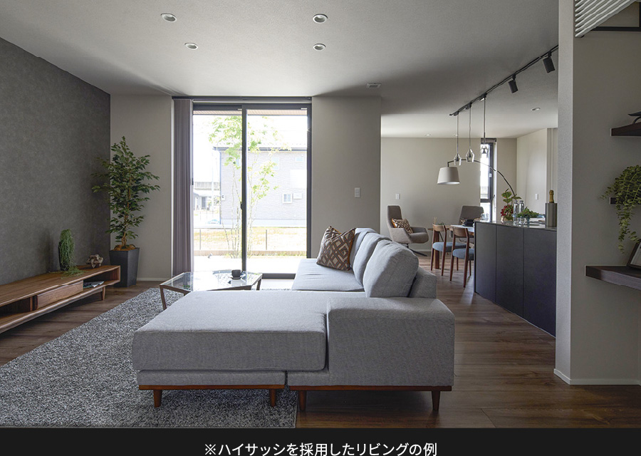 天井に届くような高さのハイサッシや、インテリア性の高いハイドアなどの計画が可能で、シンプル、かつ上質で開放感のあるデザインが実現できます。