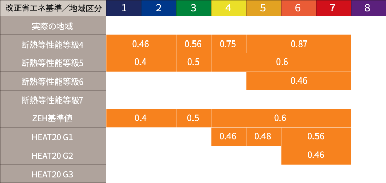 ※オレンジ網掛け部分は当社「ORIGINAL2×8」仕様の断熱性能がクリアした基準になります。