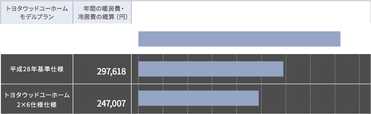 トヨタウッドユーホームと省エネ基準との暖冷房費の比較(シミュレーション)。平成4年基準と比較し2×6仕様では約60%の光熱費となり入居後のランニングコストが大幅に削減できます。