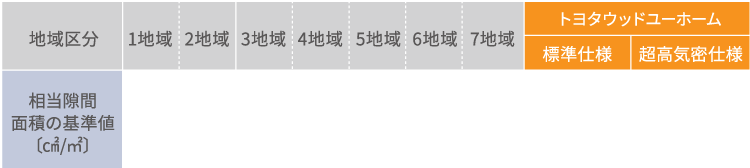 当社の標準仕様では、次世代省エネルギー基準(H11基準)における地域別の相当隙間面積(C値)と比べ、それより少ない数値が測定されています。さらに、超高気密化(相当隙間面積0.5〜0.8㎠/㎡程度)された住宅の建設も可能です。