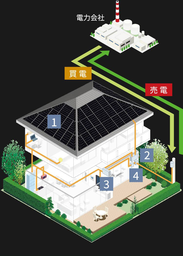 昼間に発電し、余った電気は電力会社に売ることができます。また、夜などは、従来通り電力会社から電気を買います。このような電力の売買は自動的に行われます。