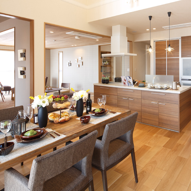 リビング、キッチン、ダイニング、さらには屋外空間までワンフロアでつながる空間は、家族がどこにいても常に気配を感じるから安心です。家族とのコミュニケーションや絆も自然と深まります。